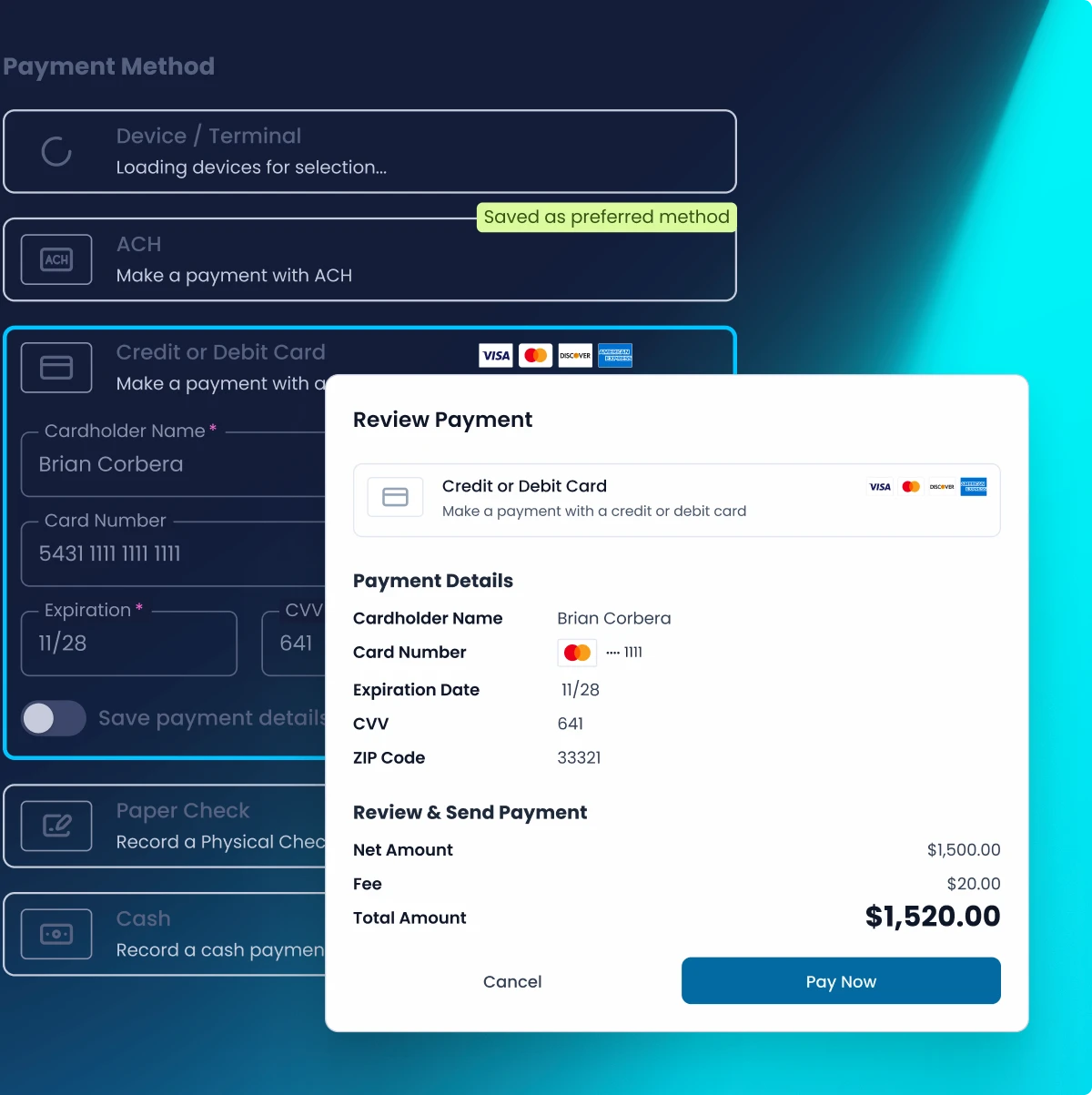Enjoy the flexibility of Credit card and ACH payments from your clients.